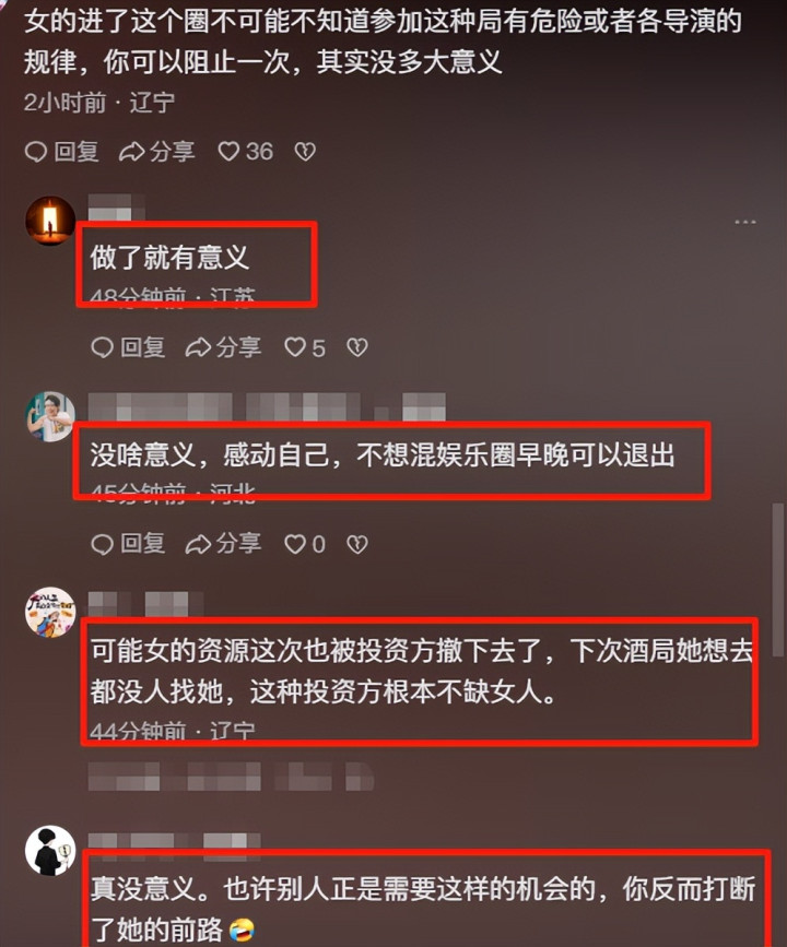 还有人对这种事司空见惯:不止是娱乐圈,我和同事喝酒都遇到过,我寻思行侠仗义呢,特地把领导和女同事隔开。领导喝了半斤多之后,掐着我的脖子在我耳边说,你赶紧和xxx换个座!