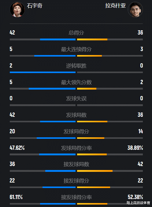 首局比赛开打之后,拉克什亚让球迷看到了他巅峰时期的统治力,精准的落点变化和势大力沉的中后场劈杀,让其一上来就咬住了比分,一直和国羽一哥打到了6平,但不得不说如今的拉克什亚,整体速率下滑明显,比分胶着阶段,在石宇奇主动提速之后,逐渐掌握住了主动权,慢慢拉开了比分,以11-9进入到了中局间歇。