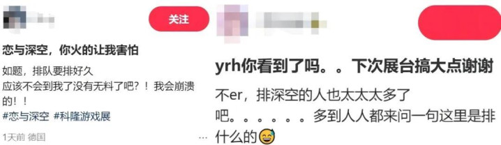 是的,今年叠纸展台的排队情况很夸张。在为《恋与深空》颁发最佳手游奖后,Gamescom Awards主持人就直言:「《恋与深空》绝对是今年科隆展队伍最长的展位之一。」