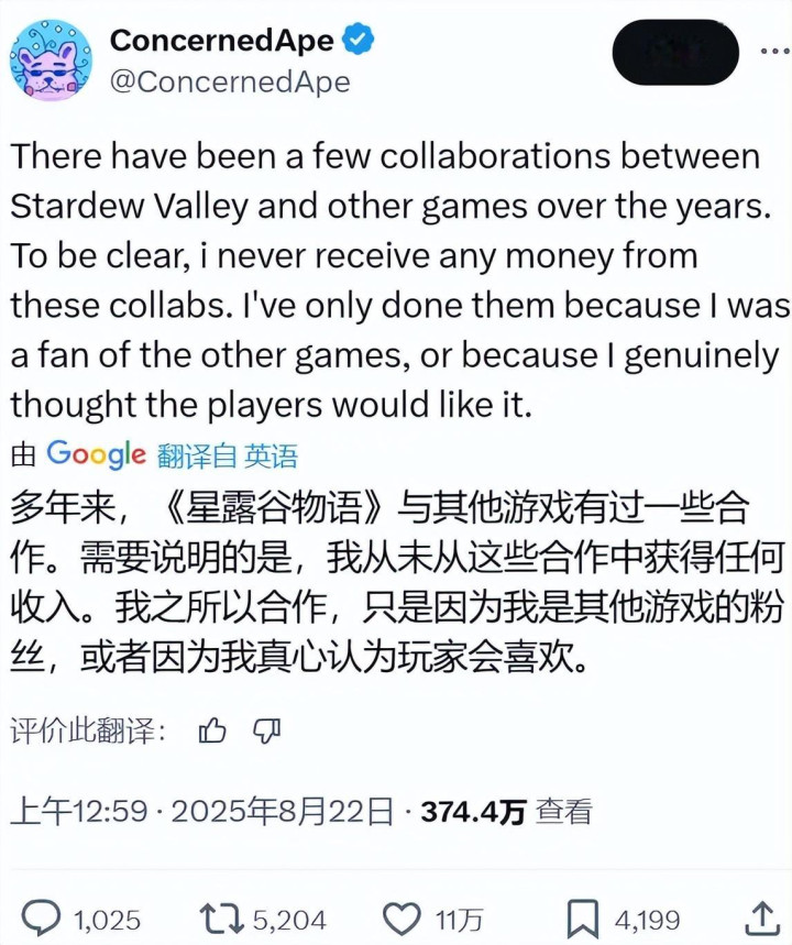 部分同样追求幸福感的开发者大佬,也用行动表达了对《无限暖暖》的支持。比如前不久《星露谷物语》创作者发文表示,他乐意和《无限暖暖》进行免费联动,因为「我之所以合作,只是因为我是其他游戏的粉丝,或因为我真心认为玩家会喜欢(这些游戏)。」