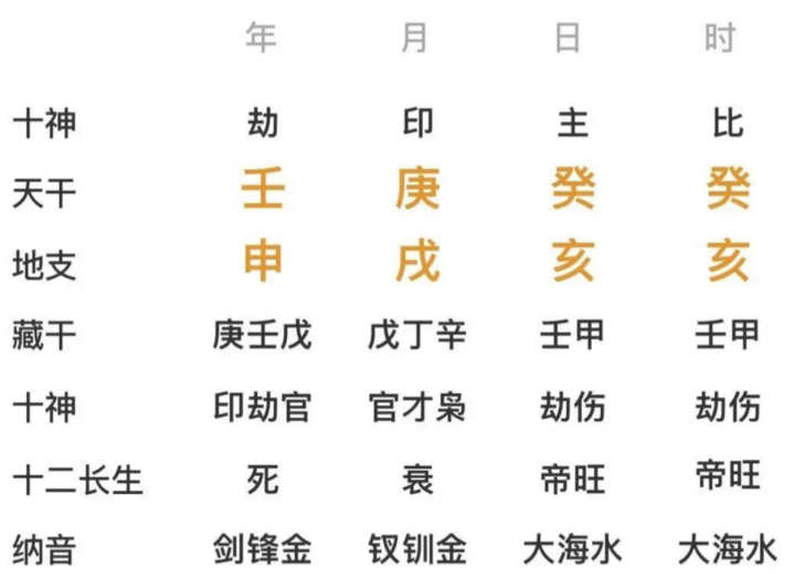 庚金正印贴身,癸亥日出生,日坐亥水临孤辰,性格偏内敛,月令戌土为正官,年支申金和与月干庚金为正印,均为正星,人也相对偏正统一些。