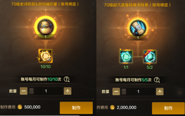 另外这也是月底了,经过大家一个月的深渊,基本上15个号全勤刷深渊的话,那么每个月也是能保底刷到至少150件史诗装备的。而这些史诗装备都可以直接分解,这样就能得到150个史诗灵魂了,而10个史诗灵魂就能制作出一个防具首饰随机史诗罐子。每个月可以制作出10个,这样大家在月底又可以获得10件史诗装备了。并且大家还可以通过超凡转换书把史诗转换成超凡装备,而且每个月是必定保底能转换成功获得一件超凡装备的,大家可别错过了。