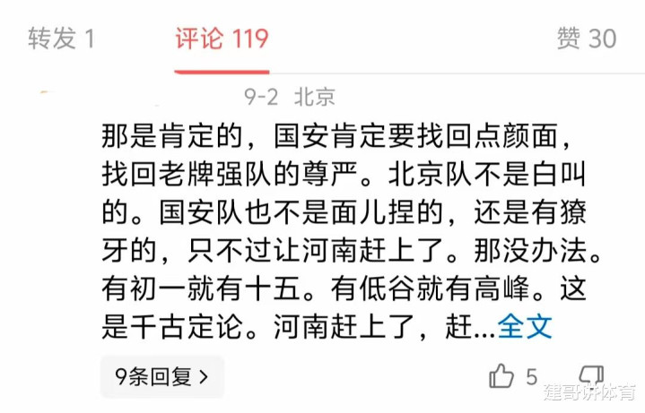 北京媒体称国安队要知耻而后勇,像斗败的狮子正愁没地方发火,河南队则正好成为目标,作为老牌强队的北京国安,在河南队面前也要证明不是面儿捏的,要露出獠牙的,只不过让河南队赶上了,当北京国安9月12日联赛踢河南队注定要发狠找回尊严后,预测河南队的这场比赛要危险了,说不定会让北京国安队送出一场比分非常大的惨案。