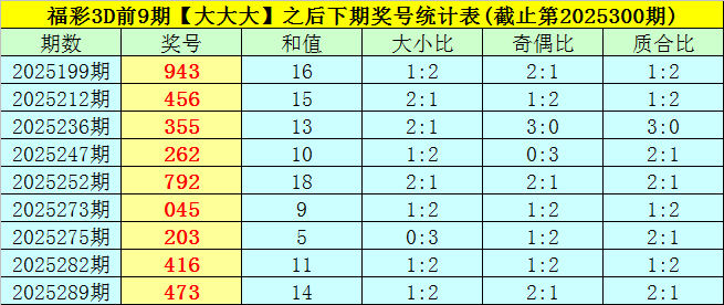 二、福彩3D上期开出奖号867,奖号大小比为3:0,大小类型开出【大大大】,该类型组合奖号在前9次分别开出号码:898-897-969-997-868-967-596-897-767;