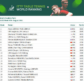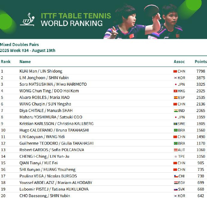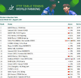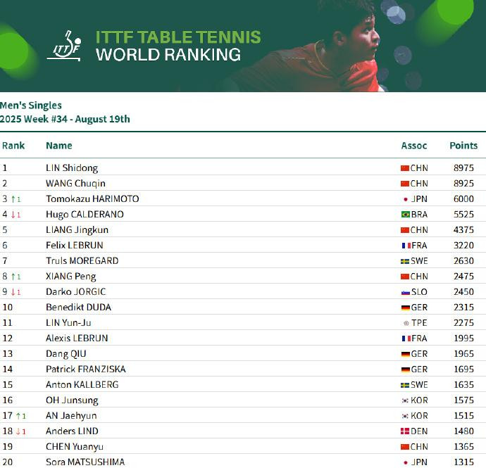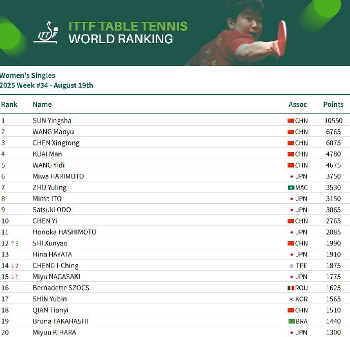 虎扑08月19日讯国际乒联发布第34周世界排名,中国球员位次如下: