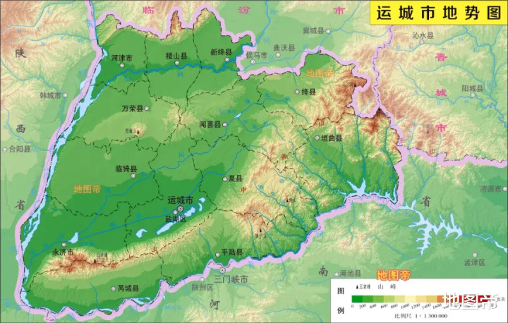 运城盆地,由黄河、峨嵋岭、中条山围成,面积2500平方千米,主要是运城市。
