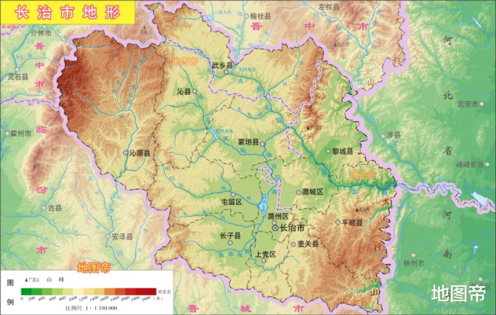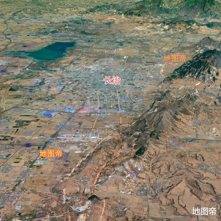 长治盆地,大致呈东北-西南走向,由太行山、太岳山围成,南北长约80千米,东西宽30-40千米,面积近2000平方千米,主要是长治市。