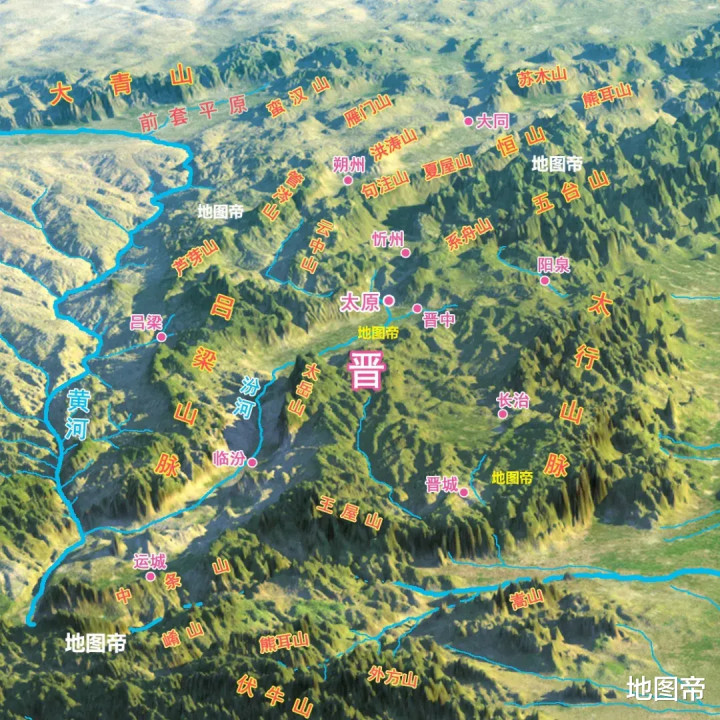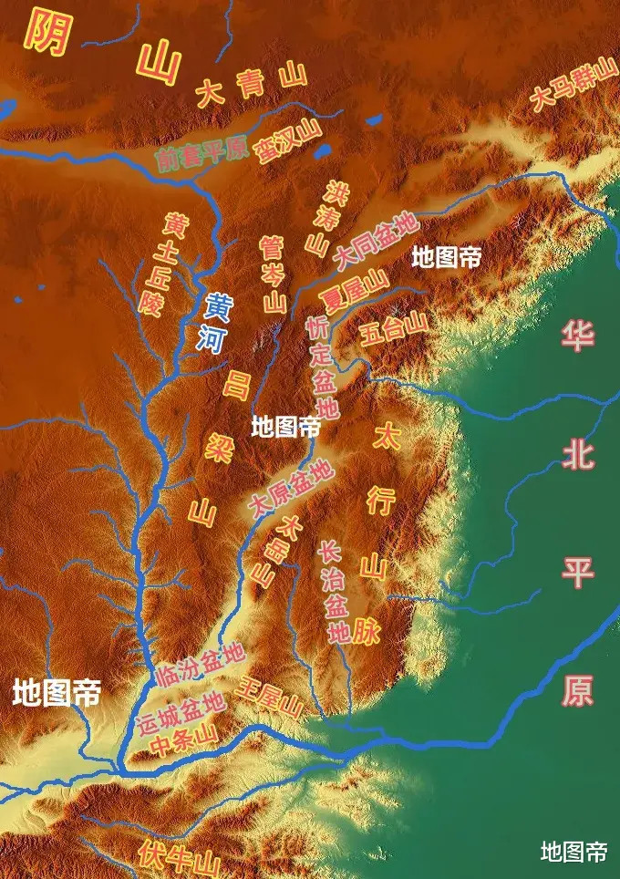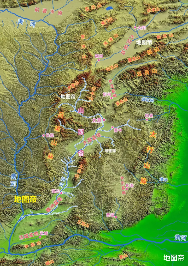 山西轮廓呈东北斜向西南的平行四边形,是黄土广泛覆盖的山地高原,内部起伏不平,河谷纵横。山西东有太行山脉,西有吕梁山脉,中间是一列盆地平原走廊,形成五大盆地:大同盆地、忻[xīn]定盆地、太原盆地、临汾盆地、运城盆地,加上东南部太行山脉上的长治盆地(上党盆地),组成山西六大盆地。