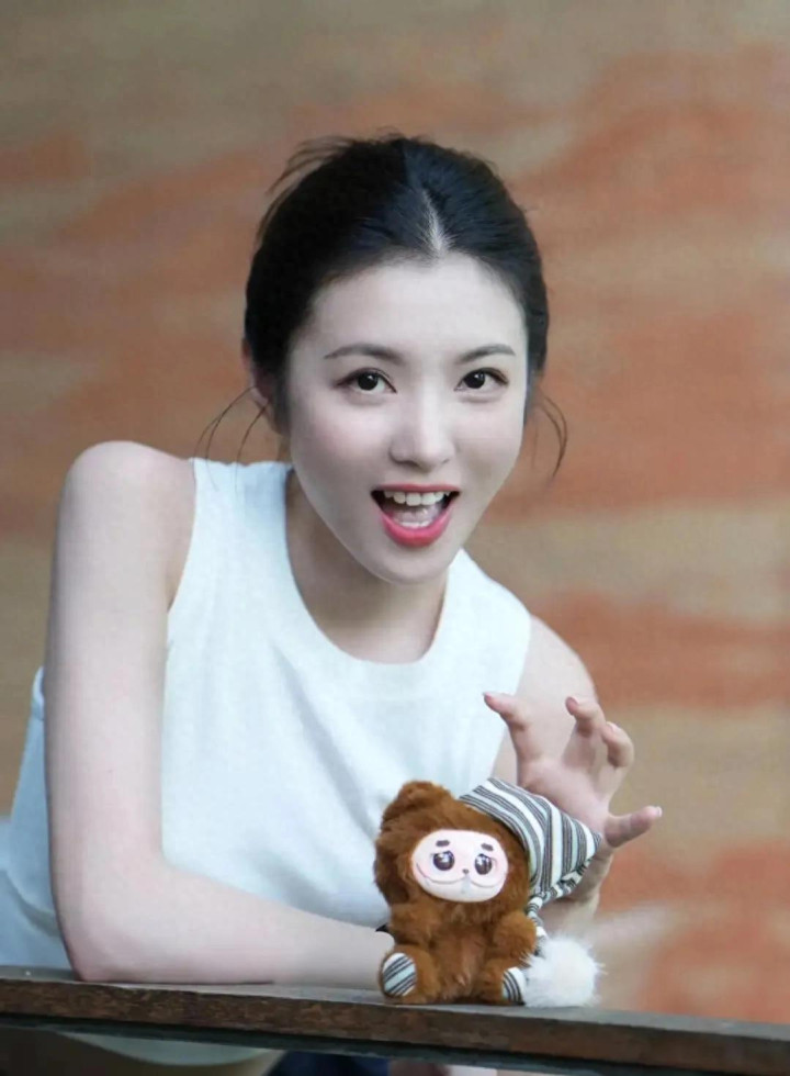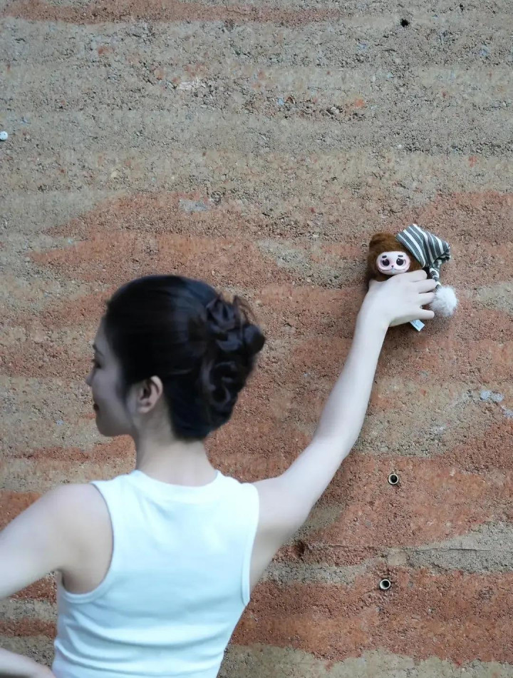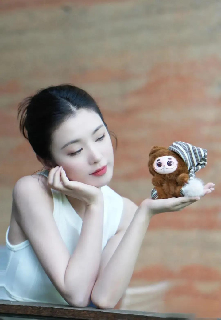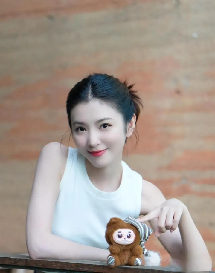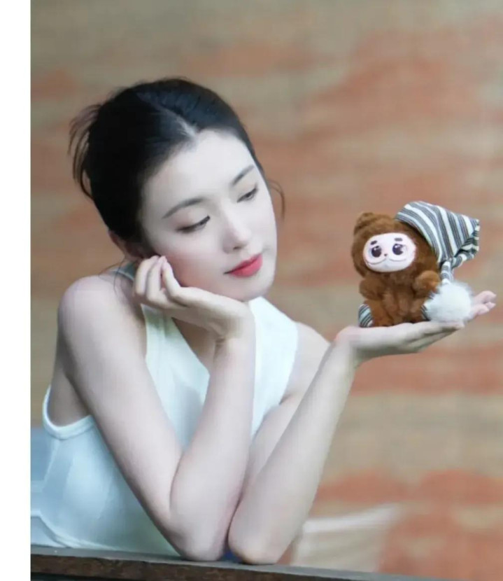 李云霄新疆随拍, 白背心配盘发, 手捧玩偶可爱与气质并存