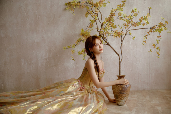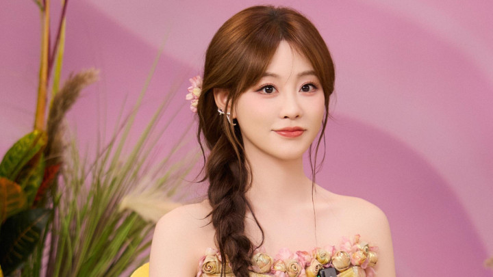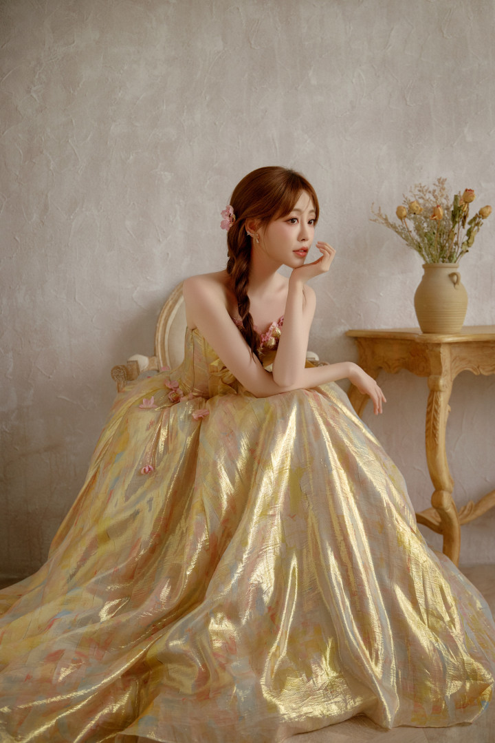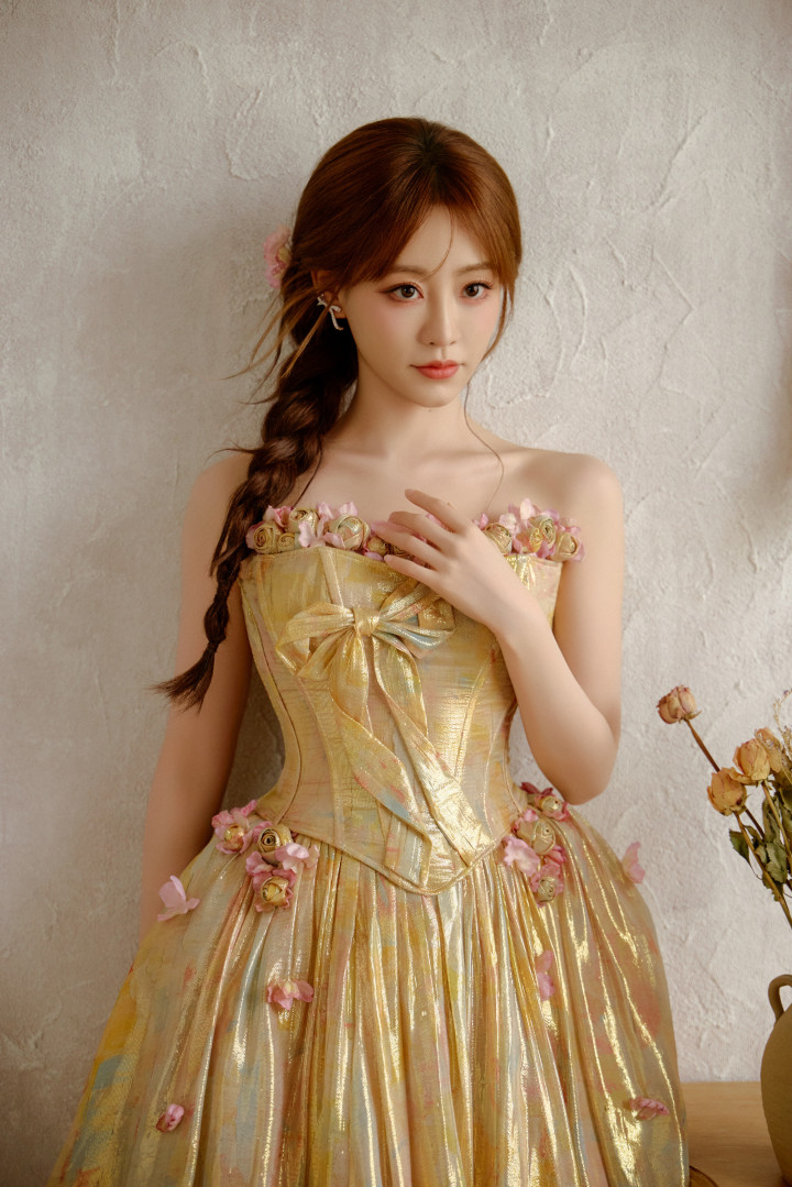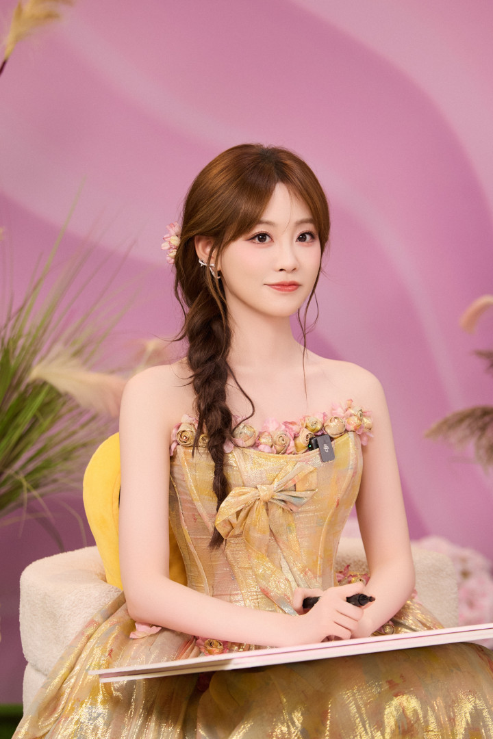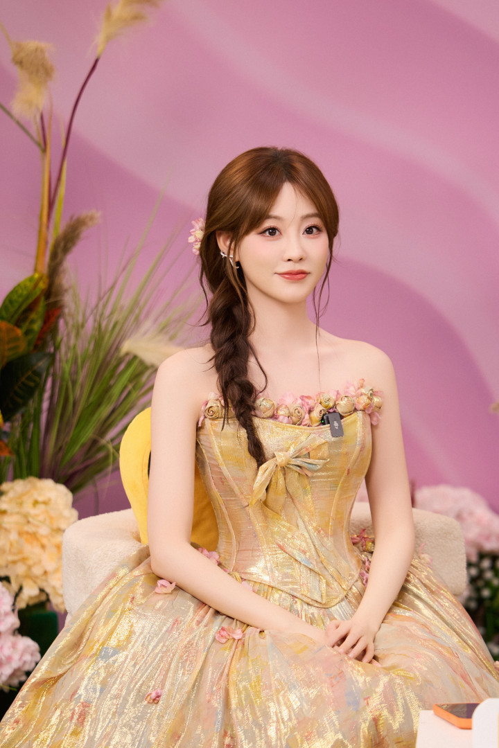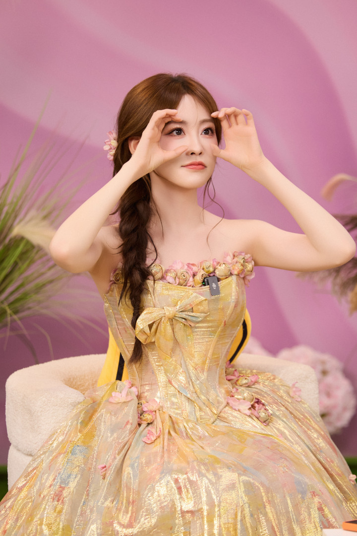 祝绪丹童话公主下凡!鎏金裙缀粉花,编发烂漫太甜美