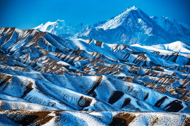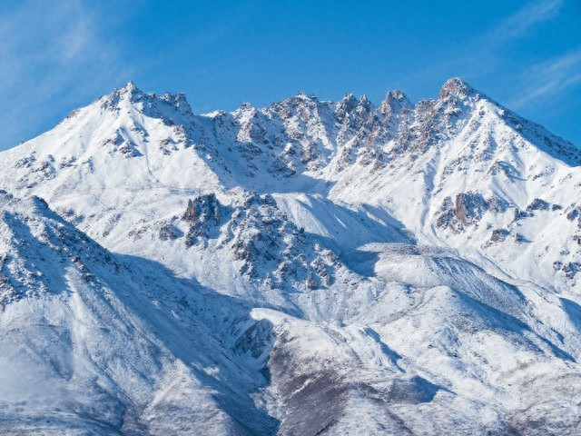 这山是常年裹雪的,到了冬天,雪线便悄悄往上走,把原本露着的赭色岩坡也盖了去。站在山脚下望,雪从峰顶一直铺到半山间,与云絮缠在一起,分不清哪是雪、哪是云,只觉得整片天空都低了,连风掠过耳际,都带着雪的清冽。山脚下的原野早没了夏日的绿,枯黄的草甸上覆着薄雪,像给大地盖了层半透明的纱,风一吹,雪粒簌簌滚,露出零星的黄,倒成了白纸上最灵动的笔触。