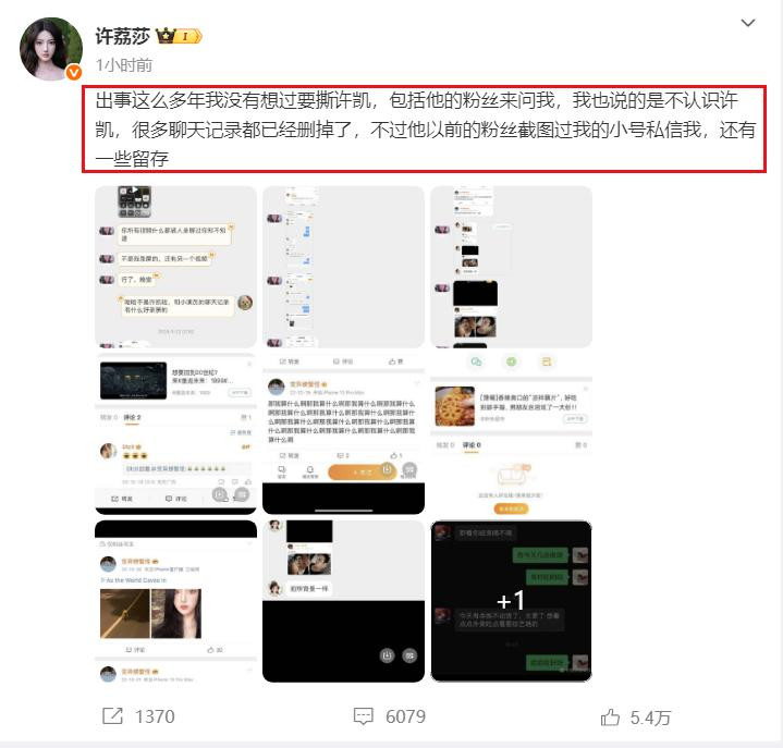 看来,今天注定是许凯的“黑色星期五”,目前,许荔莎一直是在线爆料,时隔几分钟就发一条微博,有聊天记录、有照片等等。