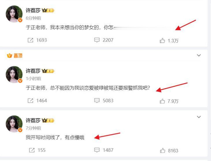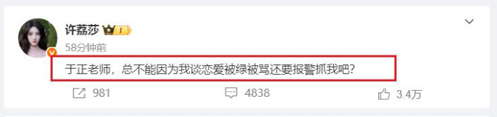 发文许凯的这些私照后,许荔莎还不忘“挖苦”一下于正,直接隔空发声:“于正老师,总不能因为我谈恋爱被绿被骂还要报警抓我吧?”