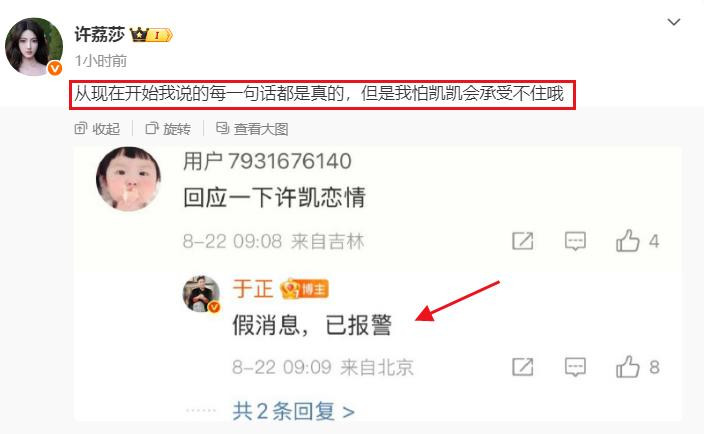 演员许荔莎正面回应,自己确实是许凯的前女友,甚至还把于正的截图发到了网上,这也算是正面和于正硬刚了,意味着不怕于正“报警抓人”。