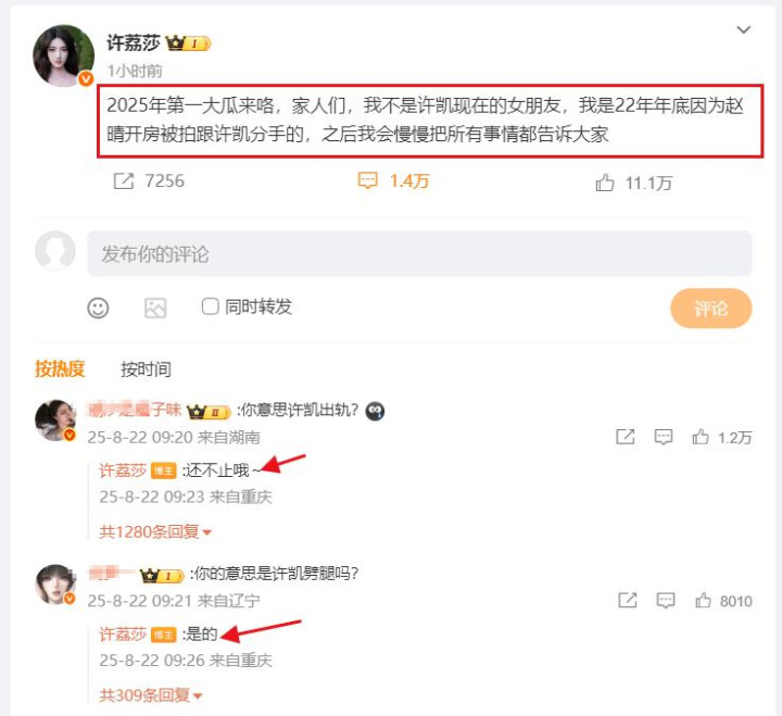 许荔莎口气很坚定,有网友在评论区询问是许凯出轨吗?她直接来了一句:“还不止哦!”意思是许凯当时在和她交往,直接还和其他女人劈腿了。