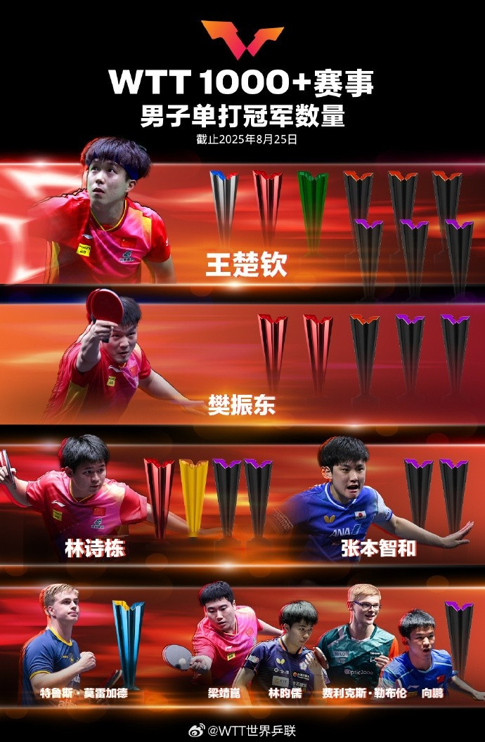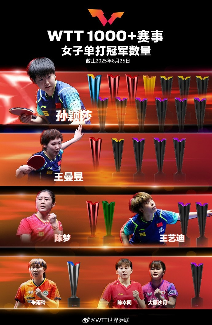 WTT官方也统计了WTT1000级别以上赛事的冠军数量,孙颖莎13冠领跑,王楚钦9冠第二,樊振东和王曼昱都夺得过5次冠军,莫雷加德首次夺得1000级别以上冠军。