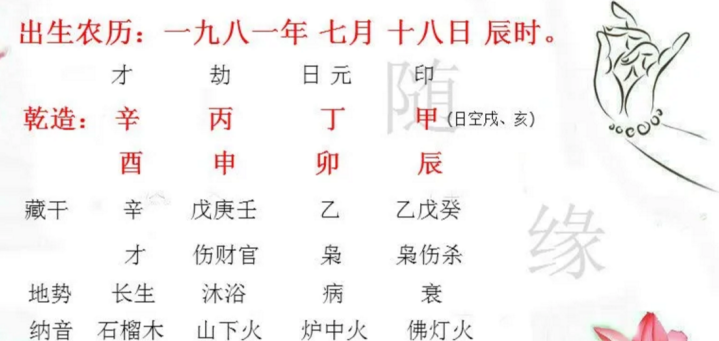 八字乾造:你老公生于辛酉年、丙申月、丁卯日、甲辰时(日空戌、亥);3岁起运:乙未;石榴木命人,每十年逢大寒之后转运,现在走在33至43岁的壬辰大运中。