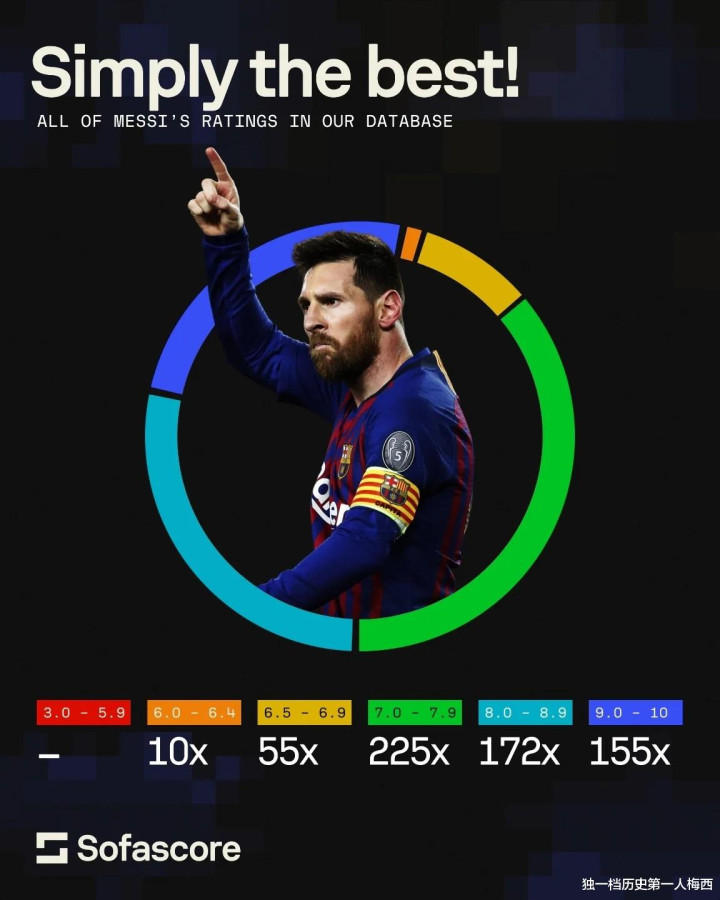 梅西有接近500次全场最佳,有121次满分10分,比历史第二、38次的C罗超过快100次。有著名评分机构Sofascore则统计并公布了他们机构对梅西的评分,不只是满分或者高分,而是把所有区域的评分都列举出来。其中8分以上的高分超过300次!9分以上的超高分达到155次!都是历史第一。而6分以下的不及格分数,梅西是0次!没有!