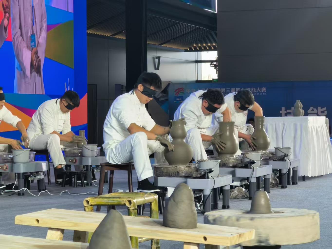 9月20日下午,第三届全国技能大赛绝活展示区,许昌陶瓷职业学院特聘教授郭君健搅动一方古朴的石质轮盘,给大家带来了令人叹为观止的钧瓷蒙眼拉坯的绝活“show”。