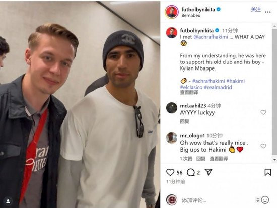 巴黎边卫阿什拉夫来到伯纳乌,观看了这场国家德比,见证老东家取胜,球迷社媒晒出与阿什拉夫的合照。